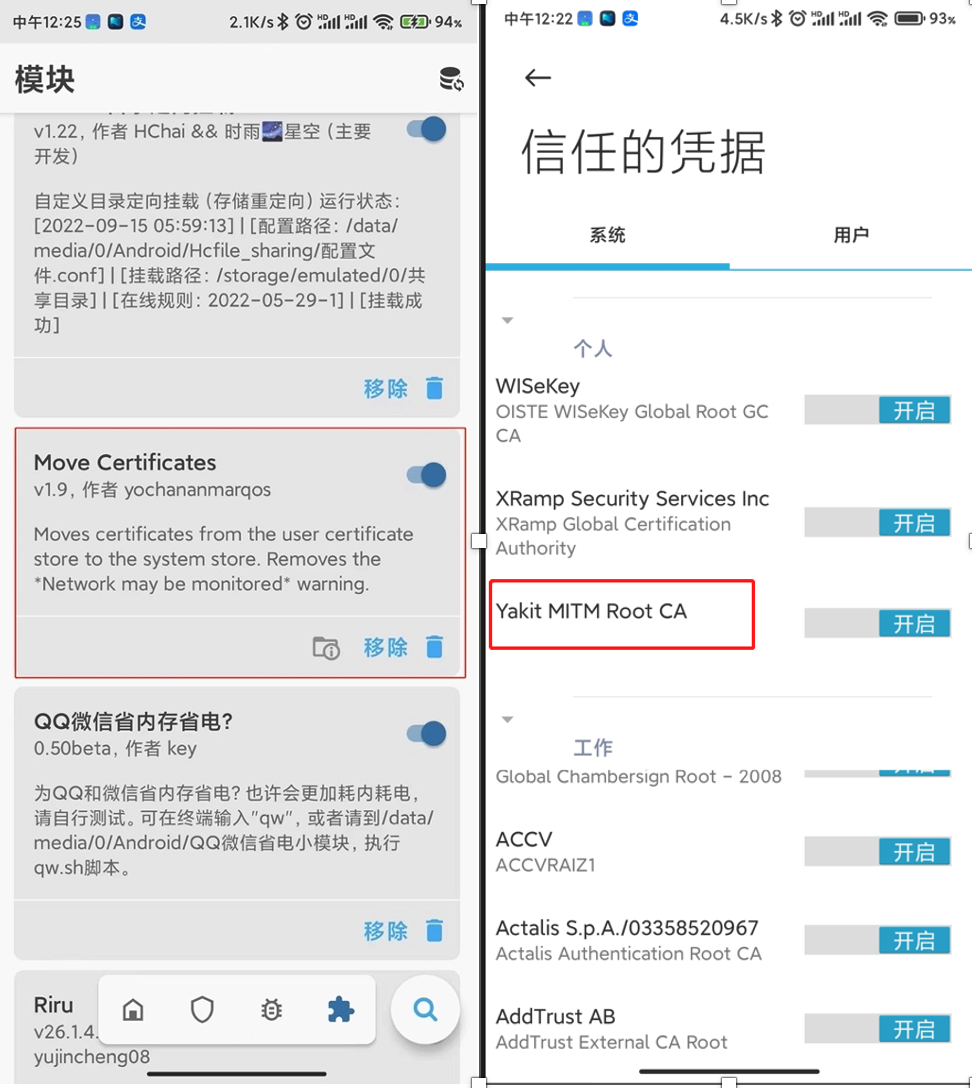 打开手机ca证书,选择手机上crt,pem格式的yakit证书进行安装,随后就会看到信任的凭据里用户栏里有yakit mitm证书,但现在还不能抓包,还需要将证书添加到系统侧,方法有很多种,直接复制文件到系统目录也行,这边我使用Move Certificates模块自动将用户证书复制到系统侧。