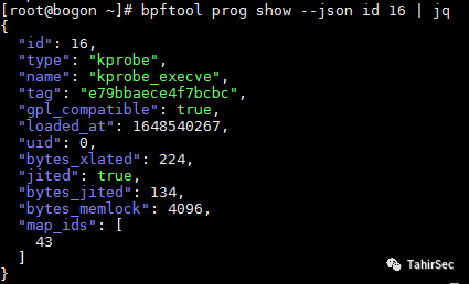 bpftool prog show --json id 16 | jq当知道程序id后,还可以使用BPFTool获取整个程序的数据。可以反编译为BPF字节码。