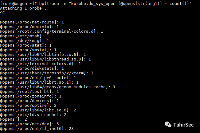当程序停止执行时,BPFTrace将打印映射的内容。它聚合计算了内核系统中打开文件的频率。默认情况下,当BPFTrace终止时,总是会打印创建的每个映射的内容。如果需要清除,可以通过使用内置函数clear来清除END块中的映射。