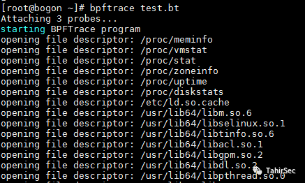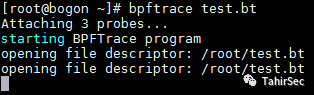 头部用关键字BEGIN标记,尾部调用用关键字END标记。这些关键字是BPFTrace保留关键字。操作块标识符定义要附加的BPF操作的探针。上面示例中,每次内核打开一个文件,都会打印一条日志。