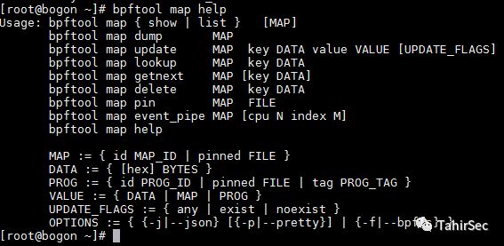 bpftool map showmap帮助信息,可以对映射做一系列操作,比如更新删除添加等等。