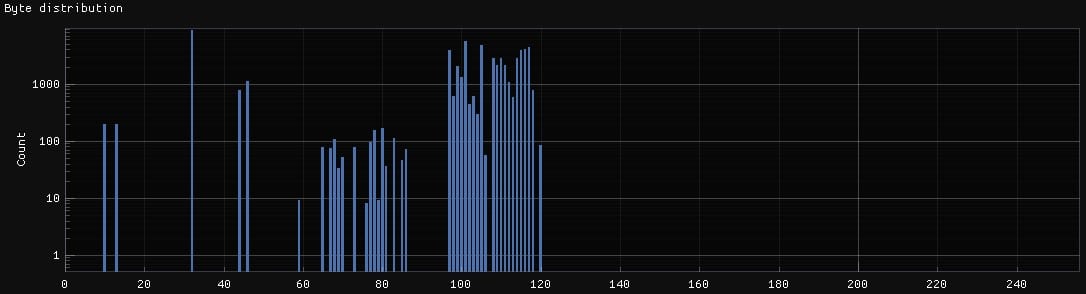 The histogram above shows a widespread use of bytes with values from 97 to 120. To a lesser extent there is also a use of bytes in the range 41 to 86. There is an isolated peak at value 32 and two smaller peaks at values 10 and 13.