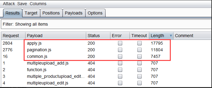 看来第一次发现得/html/目录确实存在,不过可能是apply.html不存在导致页面的404 Not Found。一级目录爆破,未发现可用一级目录,仅仅发现了3个静态文件目录。渗透测试的思路到这也即将中断了,不过此时突然萌生出一个想法:既然不存在能够正常使用的文件,那么我就继续去挖掘403目录下的文件,至少403比404要好多了,至少它是真实存在的目录!继续对/html/目录、/css/目录尝试进行敏感文件扫描,未果。使用Burpsuite的Intruder模块对/js/目录进行JavaScript文件爆破,终于获取到了可用信息!天哪,终于是获取到了3个JavaScript文件,是什么时候变成了连发现JavaScript文件都无比激动?http://xxx-desktop.xxx.com/js/apply.jshttp://xxx-desktop.xxx.com/js/pagination.jshttp://xxx-desktop.xxx.com/js/common.js