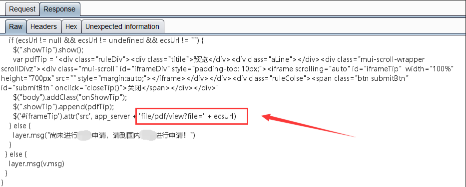 通过进一步的信息收集,在/js/common.js文件中发现发现了一级接口目录:/xxxapi/一级接口目录都做的这么复杂,也难怪目录爆破的时候没有成果了。在/js/apply.js文件中发现了系统接口:file/pdf/view?file=将一级接口目录/xxxapi/与系统接口file/pdf/view?file=进行拼接,组成可用接口:http://xxx-desktop.xxx.com/xxxapi/file/pdf/view?file=