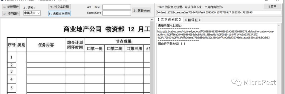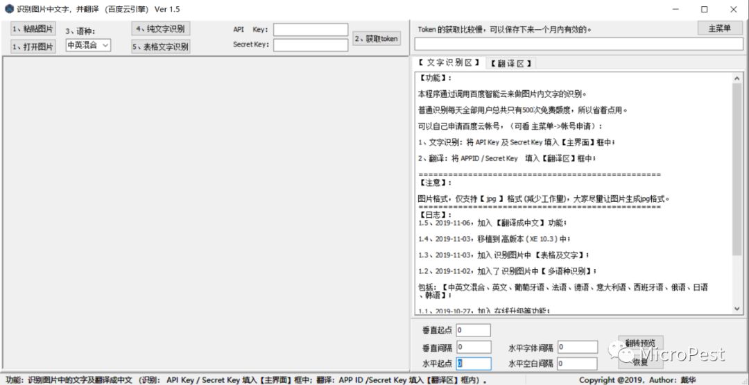 为了方便大家使用,在界面上放置了“帐号和密码”(界面上的API Key、Security Key,可在官网申请)的入口,便于个人私有使用;同时,在程序中埋入了我个人申请的“帐号和密码”,仅作临时之用;如果多人使用会超过每日的限额,我们还是提倡个人申请自己的帐号来专用,文中有如何申请帐号的指引。“帐号和密码”申请完毕后填入框内生成Token,第一次形成Token后一个月内不用再变换。