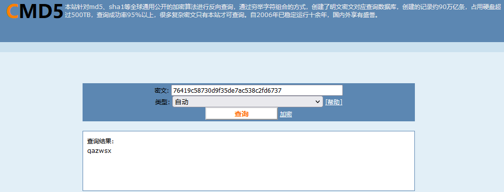 通过数据库查询网站管理员表得知其中一个管理员的密码加密密文为“76419c58730d9f35de7ac538c2fd6737”