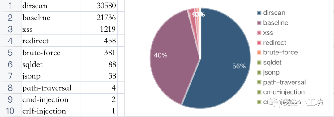 其中server-error最多,达到20711条。baseline对自动化挖src来说,没有太多价值,为了减少干扰,后来直接在配置文件关掉这个大类检测,所以这块的实际统计是偏少的。