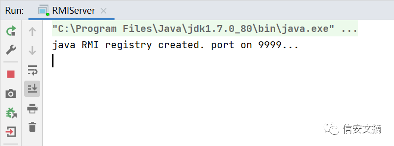 RMI server 服务启动,使用https://github.com/longofo/rmi-jndi-ldap-jrmp-jmx-jms/blob/master/java-rmi-server/src/main/java/com/longofo/javarmi/RMIServer.java开启一个简单的rmi register服务,Registry 端需要具有相应的依赖及相应 JDK 版本,这里添加commons-collections 3.1依赖,jdk版本为jdk1.7.0_80。