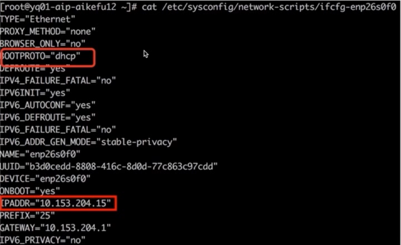 进一步查看网卡配置文件,发现网卡既配置了静态 IP,又配置了 dhcp 动态获取 IP。如图所示