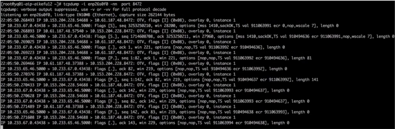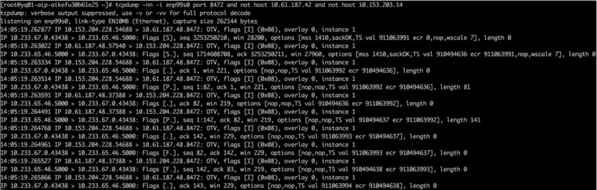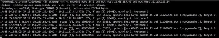 后端 Pod 所在节点的物理网卡上抓包,注意需要过滤其他正常节点的请求包,如图所示;发现收到的数据包,源地址是 10.153.204.228,但是问题节点的 IP 是 10.153.204.15。