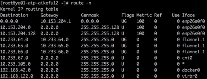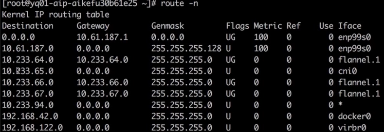 确认存在到 registry 服务的 Cluster lP 10.233.0.100 的 KUBE-SERVICES 链,跳转至 KUBE-SVC-* 链做负载均衡,再跳转至 KUBE-SEP-* 链通过 DNAT 替换为服务后端 Pod 的 IP 10.233.65.46。因此判断 iptables 规则无异常执行 route-n 查看问题节点存在访问 10.233.65.46 所在网段的路由,如图所示