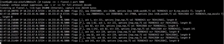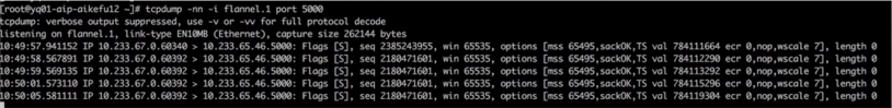 由此可以知道,NAT 的动作已经完成,而只是后端 Pod( registry 服务)没有回包,接下来在问题节点执行 curl10.233.65.46:5000,在问题节点和后端( registry 服务)Pod 所在节点的 flannel.1 上同时抓包,两节点收发正常,发包如图所示