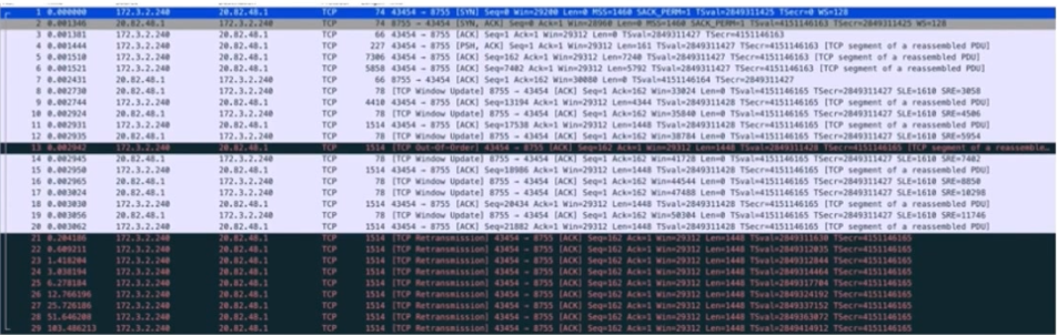通过抓包结果分析结果为 TCP 链接建立没有问题,但是在传输大数据的时候会一直重传 1514 大小的第一个数据包直至超时。怀疑是链路两端 MTU 大小不一致导致(现象:某一个固定大小的包一直超时的情况)。如图所示,1514 大小的包一直在重传。