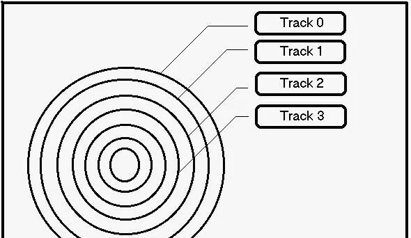 (1)磁道(Track):我们让磁头固定住,然后让盘面旋转,那么磁头所划出的同心圆,就称为一个磁道,如果再加上磁头的运动,那么磁盘上就形成了从外到里的一圈圈的磁道。看下图: