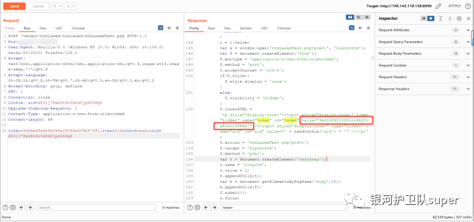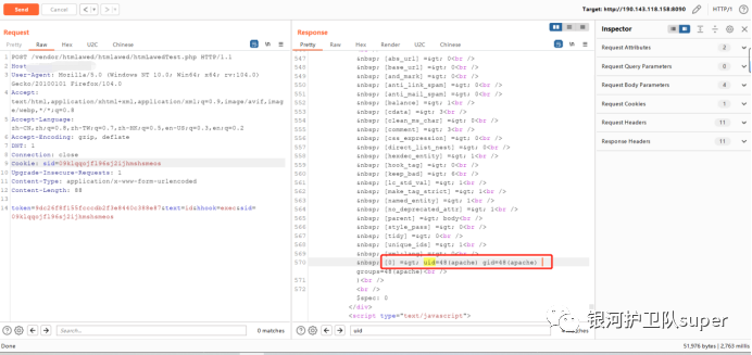 2、将获取的token和sid值替换请求数据包中数据,exec执行id命令,得到回显