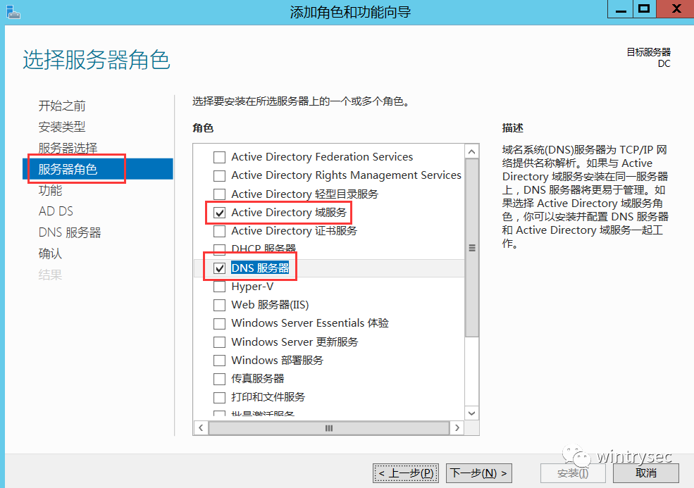 在服务器管理面板,点击 "添加角色和功能" 进入向导页面,勾选"Active Directory域服务"和"DNS服务器"复选框。