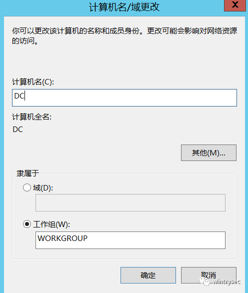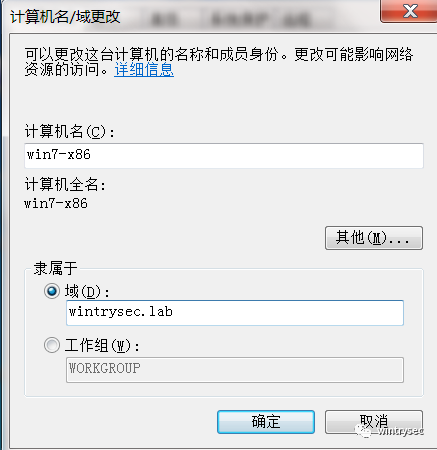 改一下计算机名称,把域名改为 wintrysec.lab,点击确定会弹出认证对话框,输入域管理员的账号和密码。