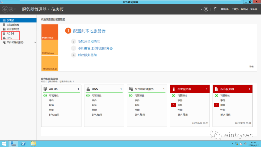 安装完重启,用域管理员账号(WINTRYSEC/Administrator)登录就能看到AD DS服务器和DNS服务器了。