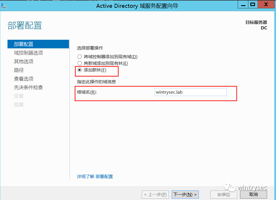 点击 "将此服务器提升为域控制器" 选项,进入配置向导页面,在 "部署配置" 部分点击添加新林并设置根域名。