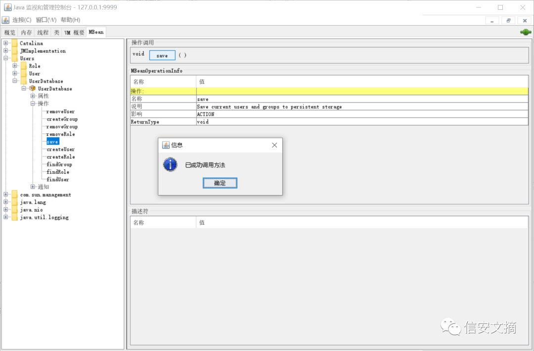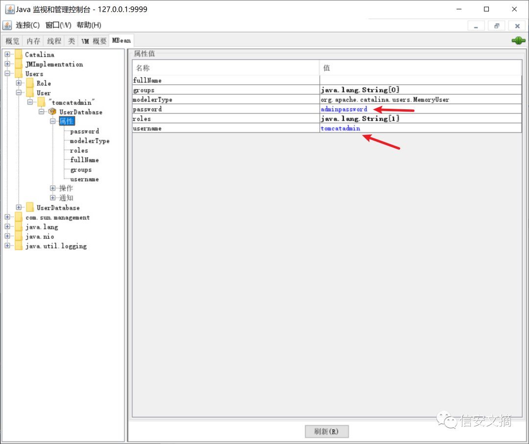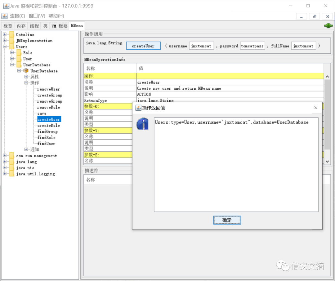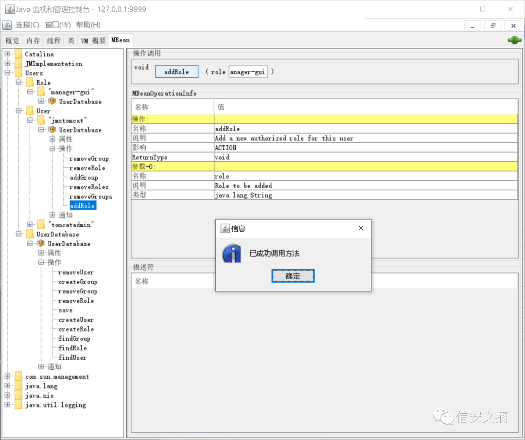 前言JMX介绍 1. JMX代码演示及架构 2. 使用jconsole图形工具监视、管理JMX使用MLet攻击JMX 1. 介绍MLet及攻击过程 2. MLet攻击示例代码 3. 小结通过MBean方法参数反序列化攻击JMX 1. JMX调用MBean的流程 2. 反序列化攻击代码 3. 小结其他反序列化攻击JMX的方式利用中间件等的特殊MBean攻击JMX 1. 通过JMX攻击Tomcat 环境配置 获取已有用户的密码 添加管理员角色用户参考链接