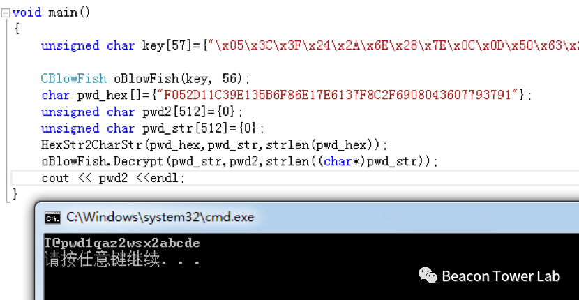 到目前为止,分析清楚了对原始密码加密的算法是Blowfish,并且找到了KEY。因为这是对称加密算法,所以可以完成对加密后的密码进行解密,还原出原始密码,完成对分析结果正确性的验证,如下图:
