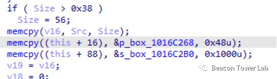 那么该算法的KEY是什么?分析后发现KEY来自上一层函数10154BC0,可以看到这里有两个KEY,分别是地址101D0480和101D0440,这里使用的是101D0480的KEY,如下图所示: