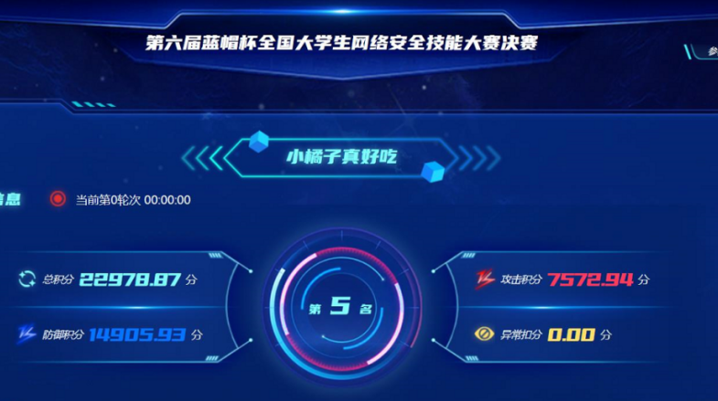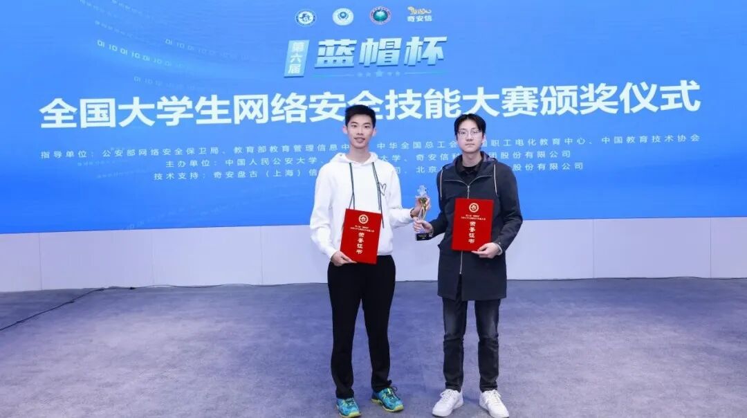 在第六届“蓝帽杯”全国大学生网络安全技能大赛中,北航网络空间安全学院赛博安全协会的小橘子真好吃战队在关振宇老师的指导下,傅云濠、胡瑞楠两位同学经过激战,从1000多支队伍中脱颖而出,在决赛中取得了一等奖第五名的优异成绩。