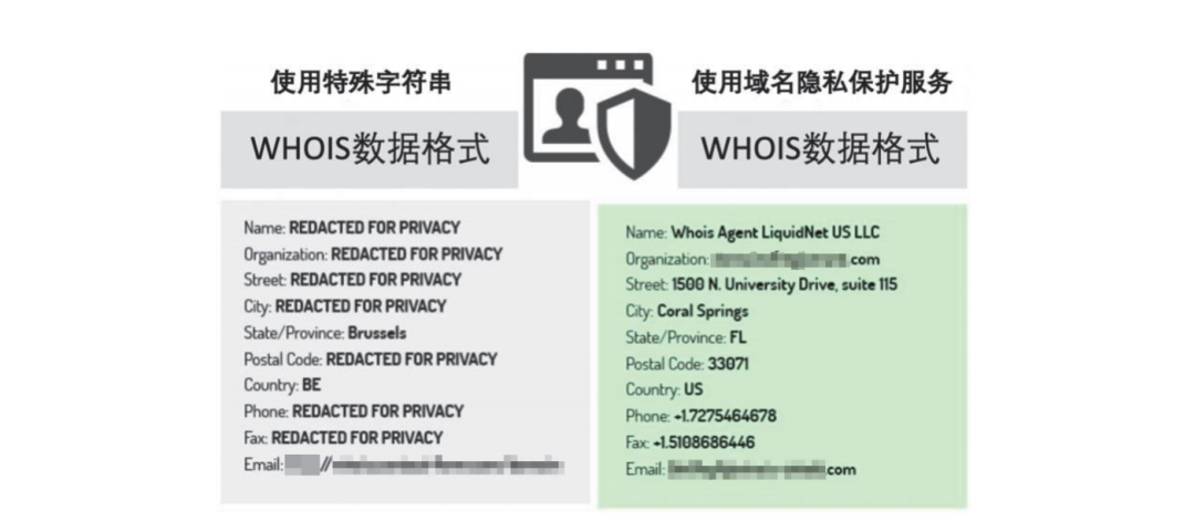 然而,国家层面隐私法规的出台,正在改变这一现状。2018年5月,欧盟的GDPR正式施行,全球机构在处理欧洲公民个人信息之前必须经过公民同意。WHOIS数据包含个人信息并且公开可查,因此需要采取措施。当月,ICANN出台临时规范,指出注册机构应该继续收集WHOIS数据,但需要在公开时使用特殊字符串(如“REDACTED FOR PRIVACY”)隐去个人信息,以符合GDPR的要求,如图2所示,使用特殊字符串(图2左)和隐私保护服务(图2右)隐去WHOIS数据中的个人信息。临时规范还指出,欧洲经济区注册人的个人信息必须隐去,其他用户的个人信息是否隐去则由注册机构决定。