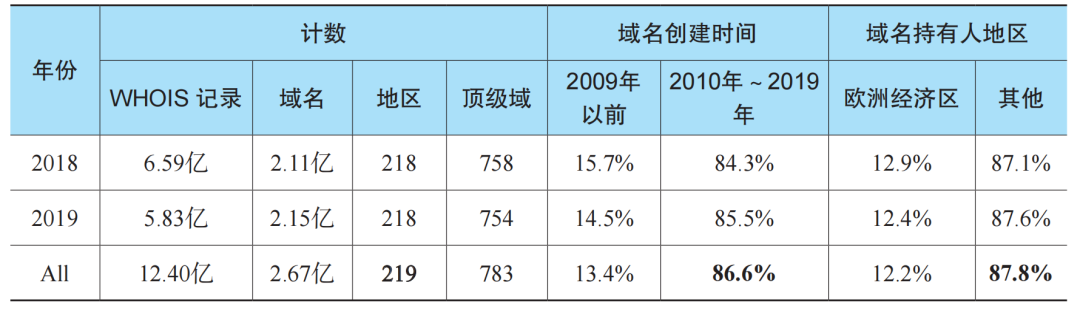 在WHOIS数据收集阶段,我们与一家知名的安全公司合作,获取了该公司从全球域名注册机构爬取的历史WHOIS数据。数据收集的时间为2018年1月至2019年12月,横跨GDPR施行前后。整个数据集包含2亿多域名的WHOIS数据,其中12.2%的域名由欧洲用户持有,如表1所示。