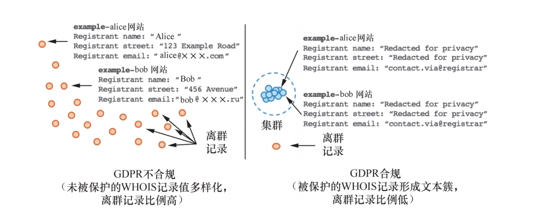 在隐私合规性分析阶段,我们设计了GCChecker系统判断注册机构是否妥善隐去WHOIS数据中的个人信息(即“合规”)。其核心原理是,在隐去WHOIS数据时,同一个域名注册机构使用的字符串一般相同,因此合规机构公开的WHOIS数据会高度相似。所以,我们提出使用文本聚类的方法将被保护的WHOIS记录聚集起来,并使用离群记录的占比来衡量机构是否合规,如图3所示。