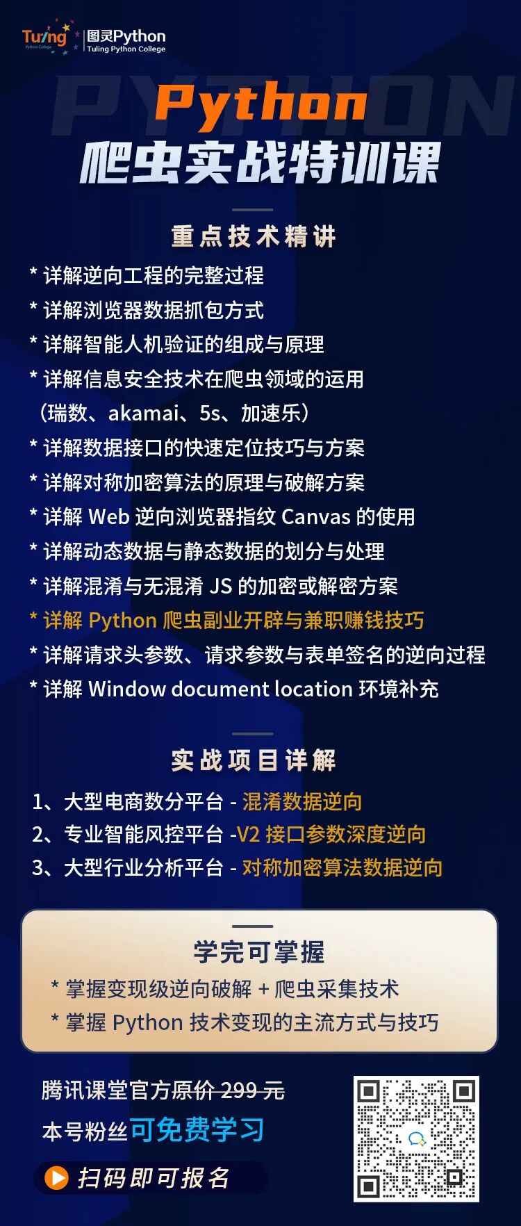 腾讯课堂官方特训费299元,本号粉丝有福利,立即报名可免费学习!这是一套专讲爬虫与反爬虫攻防的高阶技术实战课,迄今为止已帮助超3W学员快速进阶!本次课程将由国际大数据竞赛获奖大佬亲身指导,带领大家进行一线大厂高阶技术体系+多重逆向解析项目实战的综合技术速成训练!![]()