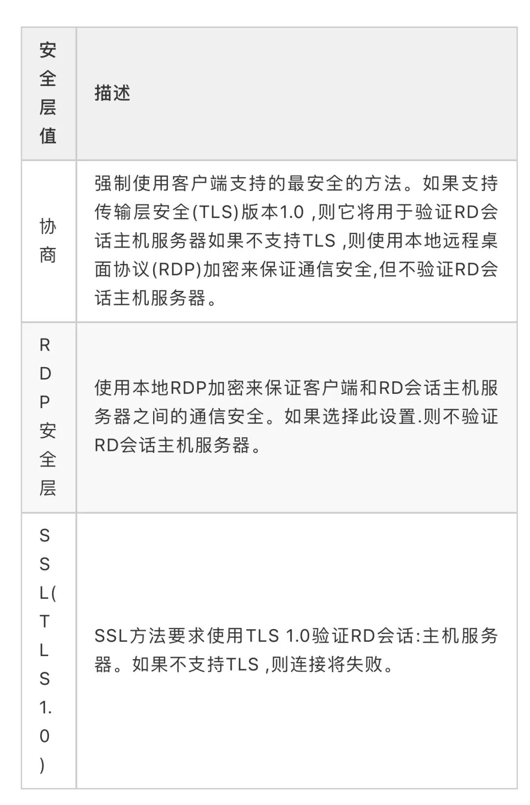 数据传输过程中的保密性主要通过检查系统是否采用TLS、SSH等加密协议,对于Windows操作系统,我们需要知道Windows操作系统远程桌面RDP是否符合传输过程中的保密性,Windows的RDP安全主要有安全层和加密级别两个参数,其中安全层有RDP安全层、协商和TLS1.0共3个值,其中默认值是协商。网上了解到在WindowsServer2008版本以上的操作系统,默认RDP支持加密。