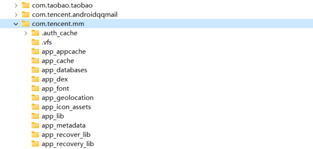 对于安卓系统而言,无论是预装应用还是非预装应用,其绝大部分数据都存储于用户区的/data/data/<PackagesName>下,比如微信(包名:com.tencent.mm)的绝大部分数据都存储于/data/data/com.tencent.mm目录下。