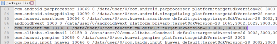 那么应用程序在进行安装和卸载操作时这个过程会被记录在两个配置文件中,分别是packages.list和packages.xml中,这两个文件位于用户区的/data/system/目录下。其中packages.list文件所记录的内容相对简单,主要记录了应用程序的包名、使用的userid、数据存放路径等。