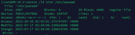 排查文件创建、修改、访问时间:stat /etc/passwd