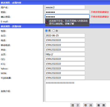 登陆账户,进入修改资料界面,仔细观察,修改密码居然不用填旧密码?果断抓包,这里的逻辑是用自己的用户名找回密码,在最后修改密码的时候抓包,改成其他用户名