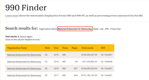990表格主要包含美国NGO财务报表,会详细记载机构年度收支情况,可以找到美政府对其资助金额。