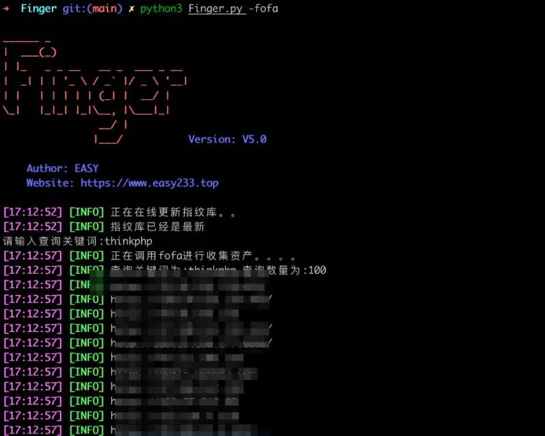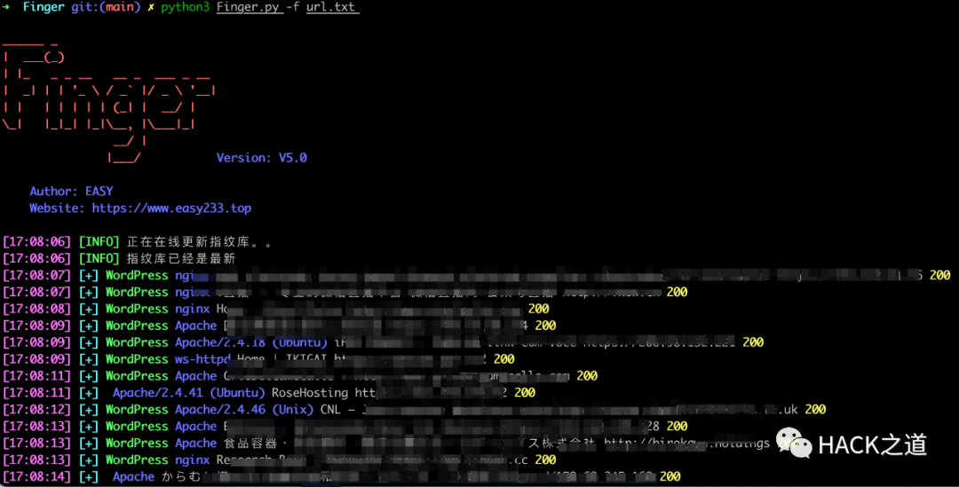 Finger定位于一款红队在大量的资产中存活探测与重点攻击系统指纹探测工具。在面临大量资产时候Finger可以快速从中查找出重点攻击系统协助我们快速展开渗透。实际效果URL批量扫描效果如下:调用api