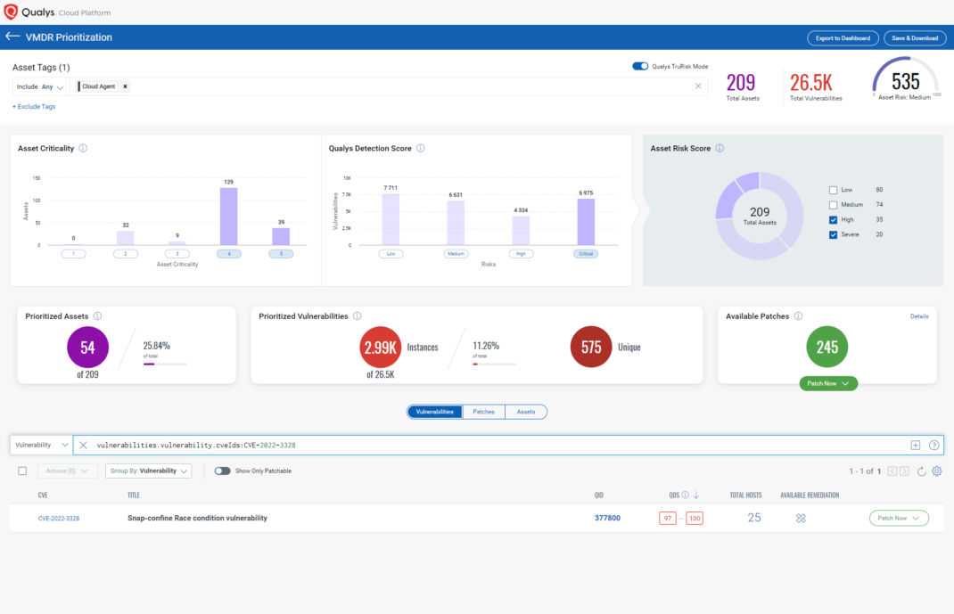 With the Qualys Unified Dashboard, you can track the vulnerability exposure within your organization and view your impacted hosts, their status, distribution across environments and overall management in real-time, allowing you to see your MTTR.
