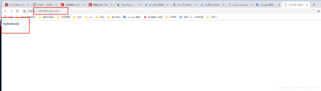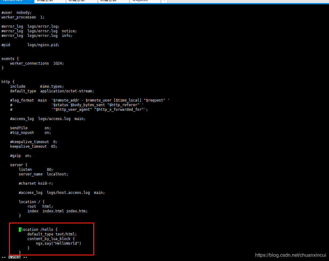 vi nginx.conf server { location /hello { default_type text/html; content_by_lua_block { ngx.say("HelloWorld") } } }