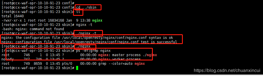 cd ../sbin ps -ef|grep nginx ./nginx -t ./nginx ps -ef|grep nginx