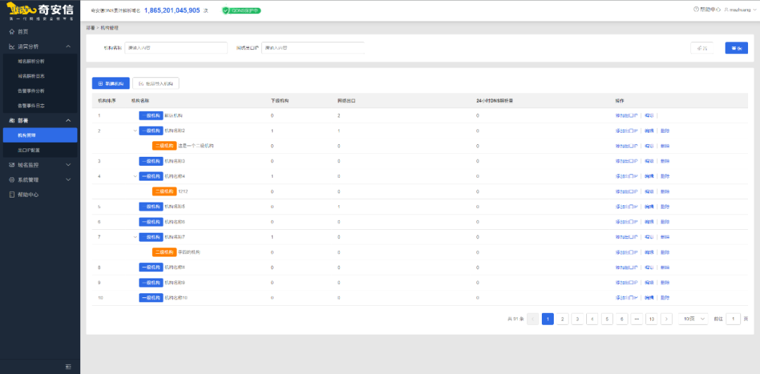 针对企业多分支机构场景,数据展示混乱、出口IP归类难等问题,用户可自定义新增分支机构并将出口IP绑定至对应机构,且可在首页进行分支机构DNS解析数据独立查询,分支机构DNS解析情况一目了然。