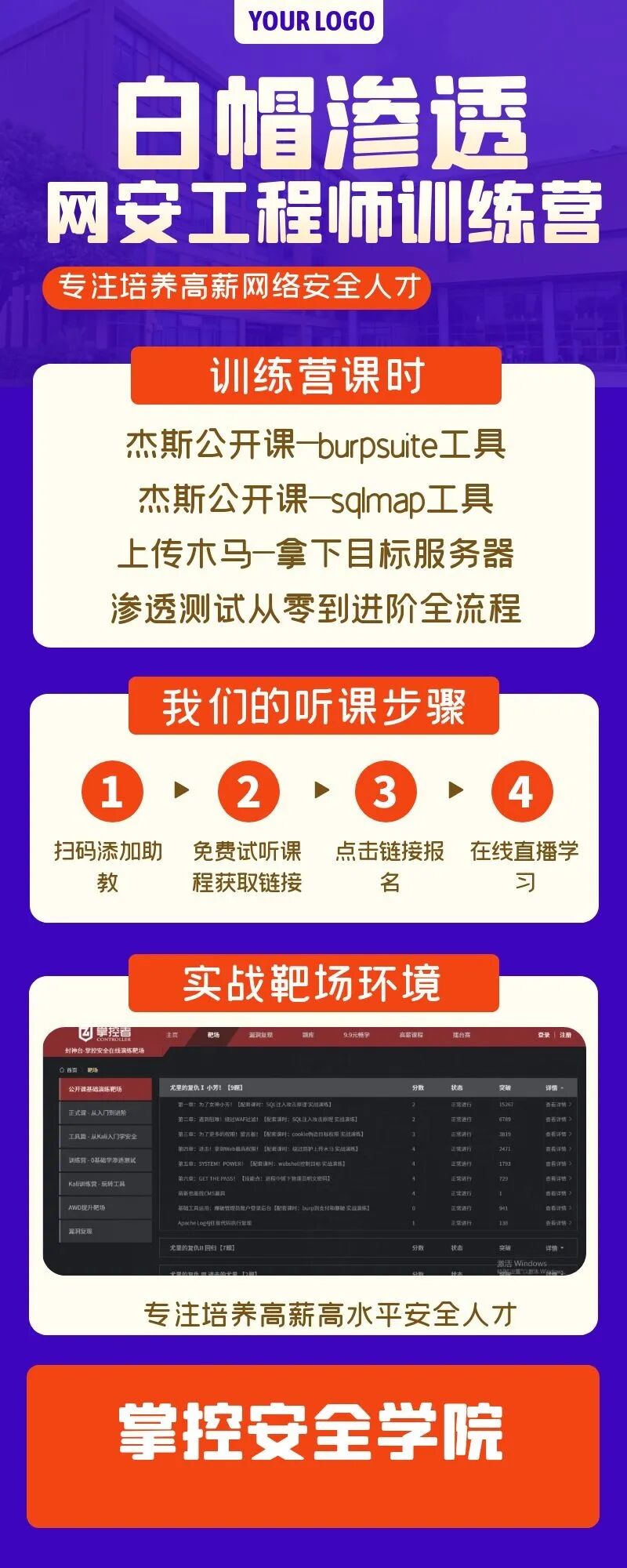 掌控安全推出的免费入门渗透课程,上述所包含的知识点,这个视频里都有涉及,如果你刚入门,可以领取这套视频,内容很全且免费,在授课过程中,以幽默风趣的方式讲述知识点,以便能够更加深入的理解。同时配有各种工具的使用及安装包(包括上文用到的burp神器)