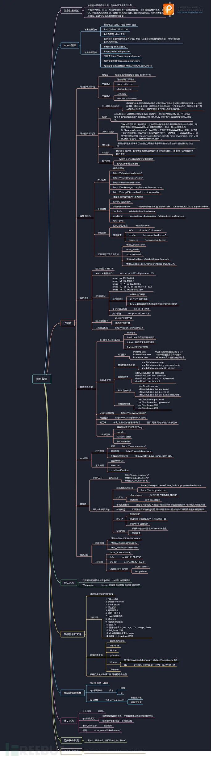 信息收集是渗透测试的前期主要工作,是非常重要的环节,收集足够多的信息才能方便接下来的测试,信息收集主要是收集网站的域名信息、子域名信息、目标网站信息、目标网站真实IP、敏感/目录文件、开放端口和中间件信息等等。通过各种渠道和手段尽可能收集到多的关于这个站点的信息,有助于我们更多的去找到渗透点,突破口。