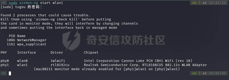 sudo airmong start wlan2 //开启网卡的监听模式