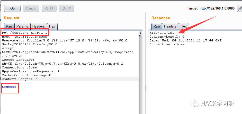 Tomcat 8.5.19GET方法PUT方法写入一个test.txt,这里看到返回201,应该已经上传成功了PUT /test.txt HTTP/1.1testpoc