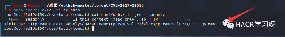 web.xml的代码,可以看到这里readonly设置为false,所以存在漏洞sudo docker exec -ti ec bash //进入docker容器cat conf/web.xml | grep readonly