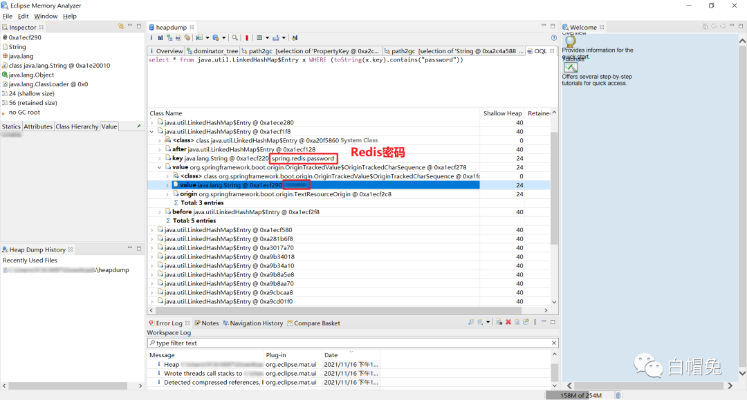 可以使用Eclipse MemoryAnalyzer 工具对泄露的heapdump文件进行分析,查询加载到内存中的明文密码信息。