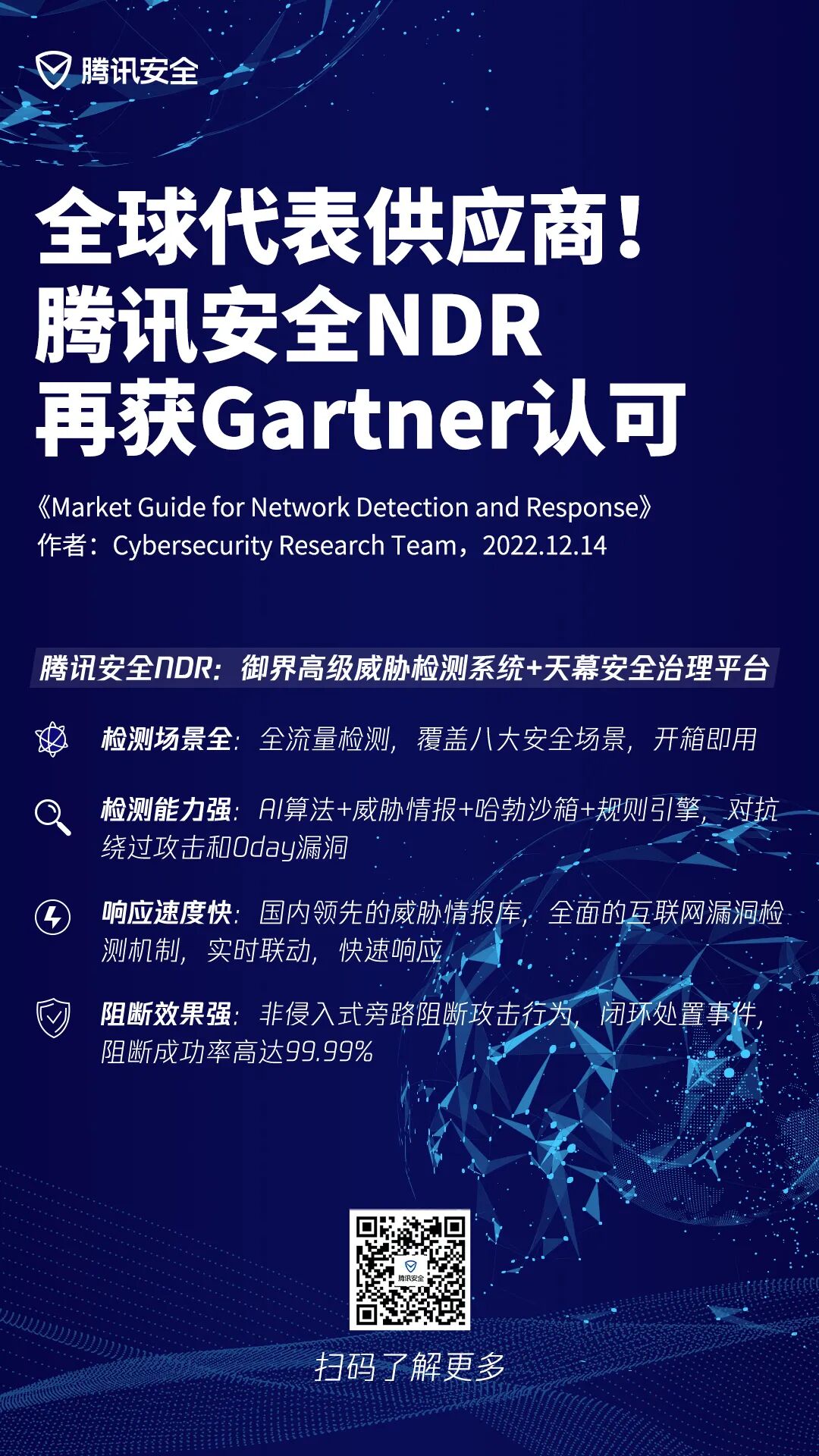 近日,国际研究机构Gartner®发布了2022年《Market Guide for Network Detection and Response》(《网络检测和响应(NDR)市场指南》)(以下简称《报告》),腾讯安全被Gartner列为全球NDR市场代表供应商。